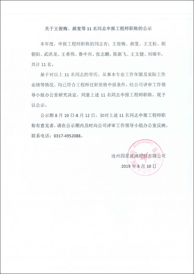 關(guān)于王俊梅、郝寬等11名同志申報(bào)工程師職稱的公示